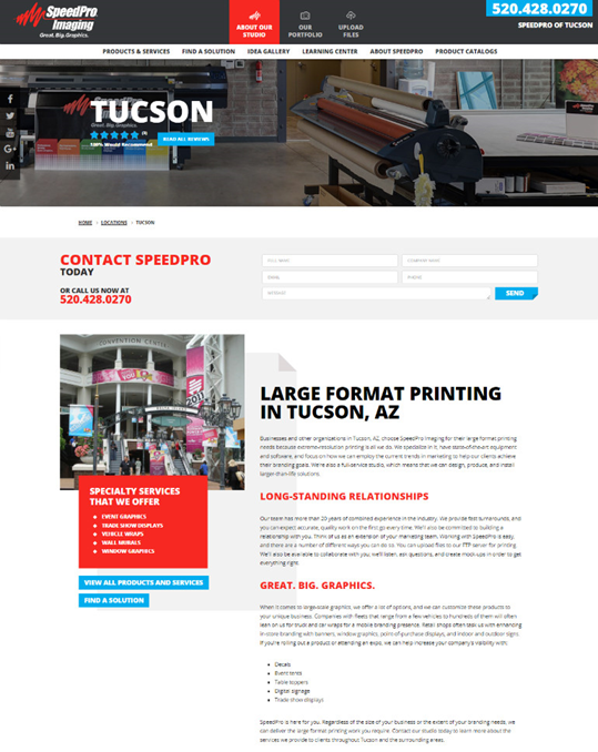 比如,點擊Tucson(圖森)之后,你會進(jìn)入一個介紹這個地點的特色服務(wù)的頁面--貼花、帳篷、桌墊、展覽陳列等等,當(dāng)然還包括該店鋪的團(tuán)隊信息。