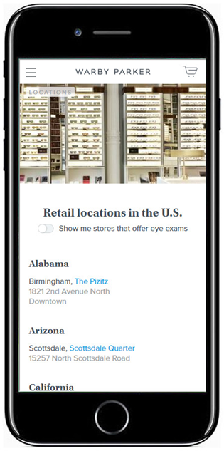 Warby Parker非常了解自己的客戶,將網(wǎng)站的地址頁針對移動端進(jìn)行了優(yōu)化。點擊進(jìn)入具體地址的著陸頁會看到聯(lián)系信息、交互式地圖、照片以及位置說明。
