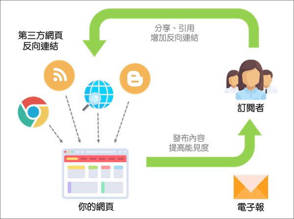 增加反向鏈接:反向鏈接指的是由其他人的網(wǎng)站連到你的網(wǎng)頁的鏈接,反向鏈接的多寡,對(duì)SEO 成效有顯著影響,若有來自排序更高或者更多元網(wǎng)站的外部鏈接連向你的網(wǎng)頁,你的網(wǎng)站也會(huì)得到越高的SEO 排位。經(jīng)由電子郵件將最新或者整理過后的網(wǎng)站內(nèi)容,發(fā)送給有興趣的訂閱者,若他們透過自己的網(wǎng)站、博客或社交媒體分享或引用你的網(wǎng)站,就能提高你的網(wǎng)頁能見度,并增加反向鏈接的數(shù)量。