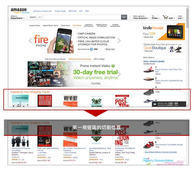 以Amazon網(wǎng)站首頁(yè)為例,無論以1024 x 768或1280 x 800等解析度瀏覽網(wǎng)站,第一視覺區(qū)中滿足了上述四個(gè)元素,放置了最重要的資訊、圖片,并讓使用者感覺網(wǎng)頁(yè)下方還有內(nèi)容,增加往下瀏覽的意愿。